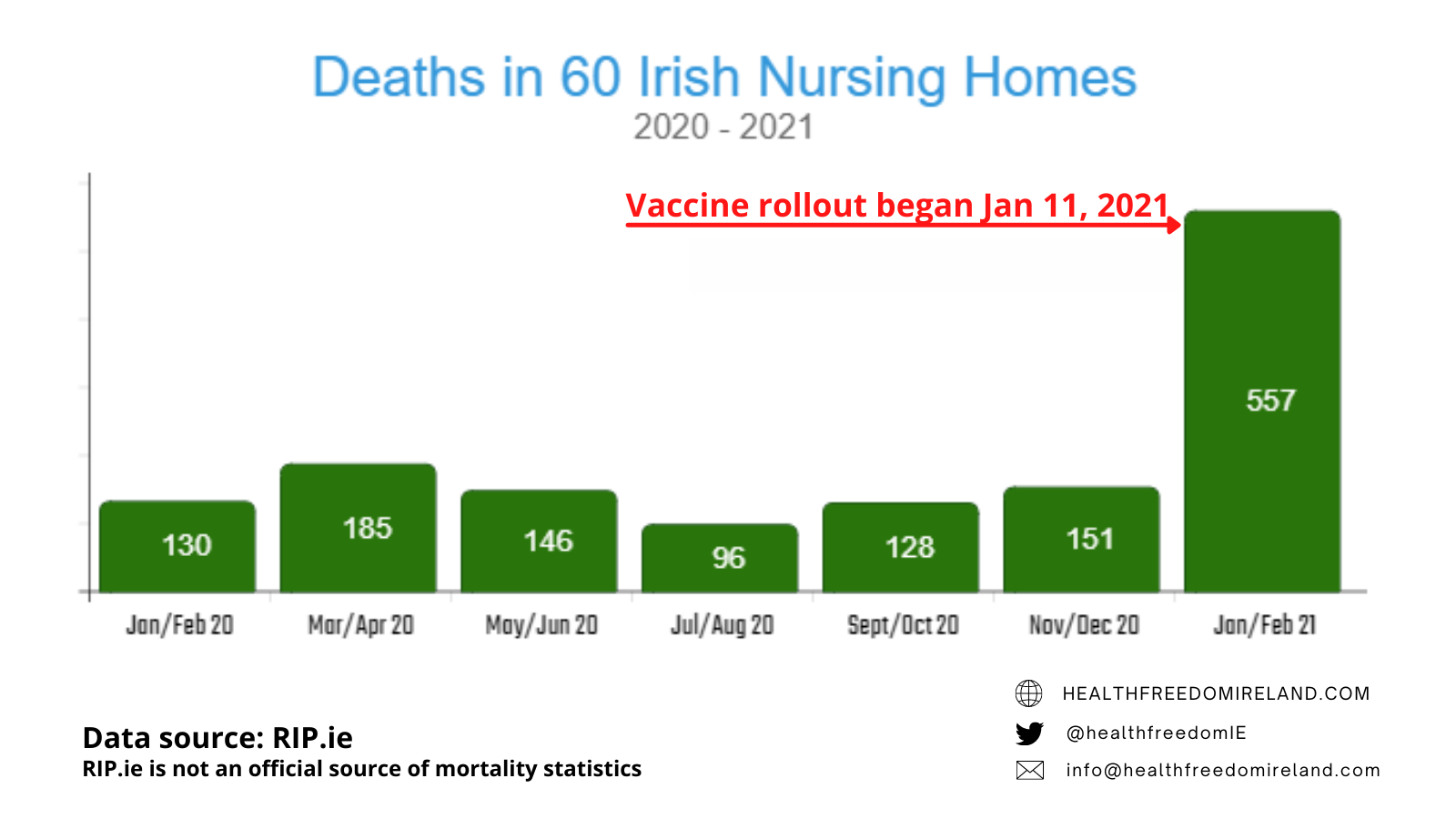 | Irish Nursing Home Deaths 2021 national | health / disability issues | news report Sunday March 14, 2021 00:57 by hfi![]() It has been brought to our attention that there has been a sudden and dramatic rise in deaths of nursing home residents since approximately mid January. Having looked at the data further we believe this needs to be investigated by the relevant authorities urgently. On Tuesday 9th March 2021 we notified this situation by email and registered letter to the Taoiseach, Minister for Health, HSE, HIQA and HPRA. Concern over second wave of deaths in Irish nursing homesWith the extension of the third lockdown in the Republic of Ireland until at least the 5th of April, Ireland is one of the most restricted countries in Europe [1]. The lockdowns and restrictions have been justified on the basis that they were to protect the most vulnerable in society, namely our elderly and those with underlying medical conditions. The incessant repetition of this narrative from the mainstream media has left these policies relatively unquestioned by the general public. Health Freedom Ireland was made aware of excess deaths in Nursing homes from the third week of January 2021. Following further analysis of publicly available data on the COVID-19 pandemic in Ireland, the picture that emerges is that COVID-19 policies, have fallen far short of helping the most vulnerable members in society. The official COVID-19 responses have lacked transparency, adaptability and efficiency. In the first lockdown over half of all deaths occurred in Nursing Homes [2]. It is on the public record that the HSE moved large numbers of elderly patients from hospitals into nursing homes to clear hospital beds, and did not test them for COVID-19. This policy led to large numbers of outbreaks in nursing homes, which were inadequately resourced with medical staff and PPE [3]. Health Freedom Ireland carried out research on deaths in a sample of 60 nursing homes from January 2020 to February 2021, combined with publicly available pandemic data. The results of this study are shown in Figures 1 & 2 below. The data graphed in Figures 1, 2 & 3 are discussed in the following paragraphs. Please note that COVID-19 case trends are referred to as waves as often there is a lag between government restrictions and epidemiological events. 1. First Covid-19 Wave: 29th Feb – 20th May 2020Despite a general lockdown being announced on the 27th of March, deaths in Ireland peaked on the 24th of April. In the nursing home sample reviewed by HFI there were 129 deaths. This was a 65% increase above the yearly average of 76 deaths in the nursing home sample (see Fig.1). During this period the overall case fatality rate (CFR) for COVID-19 classified deaths in the Irish population was 6.46%. Total COVID-19 classified deaths in the State were 1571. Total average deaths per day was 19. During the first wave deaths increased by 12.5% on average per day. This period accounted for 36.37% of the total deaths classified as COVID-19 in Ireland to date (See Fig. 2). 2. Second Wave: September 1st – 30th of November 2020During the second wave of COVID-19 cases, deaths in the nursing home sample set were below its yearly average. During this period the overall case fatality rate of COVID-19 in Ireland was 0.63%. There were 276 deaths attributed to COVID-19 in this period. There were 3 deaths per day on average. COVID-19 classified deaths increased by 0.16% per day on average. This period accounted for 6.39% of the total classified deaths in the COVID-19 pandemic. 3. Third Wave: 15th December – 31st of December 2021 Pre-Vaccine Rollout.Deaths in the nursing home sample in December and January were 88 and 104 respectively (See Fig.1). During this period the case fatality rate of COVID-19 in Ireland was 0.69% similar to the second wave. There were 103 deaths attributed to COVID-19 in this period. There were 7 deaths per day on average. COVID-19 classified deaths increased by 0.3% per day on average. This period accounted for 2.38% of the total deaths in the COVID-19 pandemic. This was not entirely unexpected, due to the seasonal nature of respiratory illnesses [5], [6] and a large number of COVID-19 cases reported. 4. Lockdown 3: Post-Vaccine Rollout 1st January 2021 – PresentDuring this period deaths in the HFI nursing home sample increased to 444. This is a staggering 484% increase on the previous yearly average number of deaths in the study sample (see Fig.1). In this same period the case fatality rate of COVID-19 in Ireland doubled to 1.78%. There have been 2251 deaths attributed to COVID-19 in this period. There have been 33 deaths per day on average. COVID-19 classified deaths increased by 1.02% per day on average, triple the rate before the vaccine rollout. This period has accounted for 50.03% of the total deaths in the COVID-19 pandemic, by far the most deadly phase of the crisis. An analysis of the HSE hospital capacity during this period shows that COVID-19 patients in ICU peaked on the 23rd of January with 221 patients, declining to 134 on the 28th of February, the date for which the latest data was available for. COVID-19 hospitalisations in non-intensive care peaked at 2020 patients on the 18th of January, declining to 554 patients on the 28th of February, the date at which latest data was available for. Thus even if this decline in ICU and hospitalisations were a result of death, the mortality rates during the post vaccination rollout indicate that a significant amount of these deaths were occurring outside the hospital system. Health Freedom Ireland have raised these concerns with the Taoiseach, Minister for Health, HSE, HIQA, and HPRA. HFI has requested a suspension to the vaccine rollout pending an immediate investigation by the above parties to provide transparency and assurance that the vaccination rollout is safe and working as intended. References[1] Blavatnik School of Government, University of Oxford, Radcliffe Observatory Quarter,
