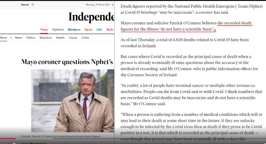 The real tragedy is that government everywhere have been using a relentless campaign of fear and propaganda through lies and manipulation of statistics that has been so successful that unfortunately significant fractions of the population think the risk of series ill-health or even death is tens of thousands of time higher than it really is and at the same time making out that the Covid experiment vaccines are far safer than the are when in reality they are not properly tested. dangerous and nobody knows whether people are taking onboard ticking biological timebombs that could cause devastation in the form of a multitude of auto-immune reactions in people. A good example of the manipulation and the real risks -and that is just based on the utterly unreliable PCR test which means the true risks of Covid are even lower, can be found in this presentation by Ivor Cummins. See: video at https://odysee.com/@IvorCummins:f/ultimate-explanation-of-ireland:0 Caption: Battle of the Experts - on Primetime Radio Show - Mortality Reality Revealed! |