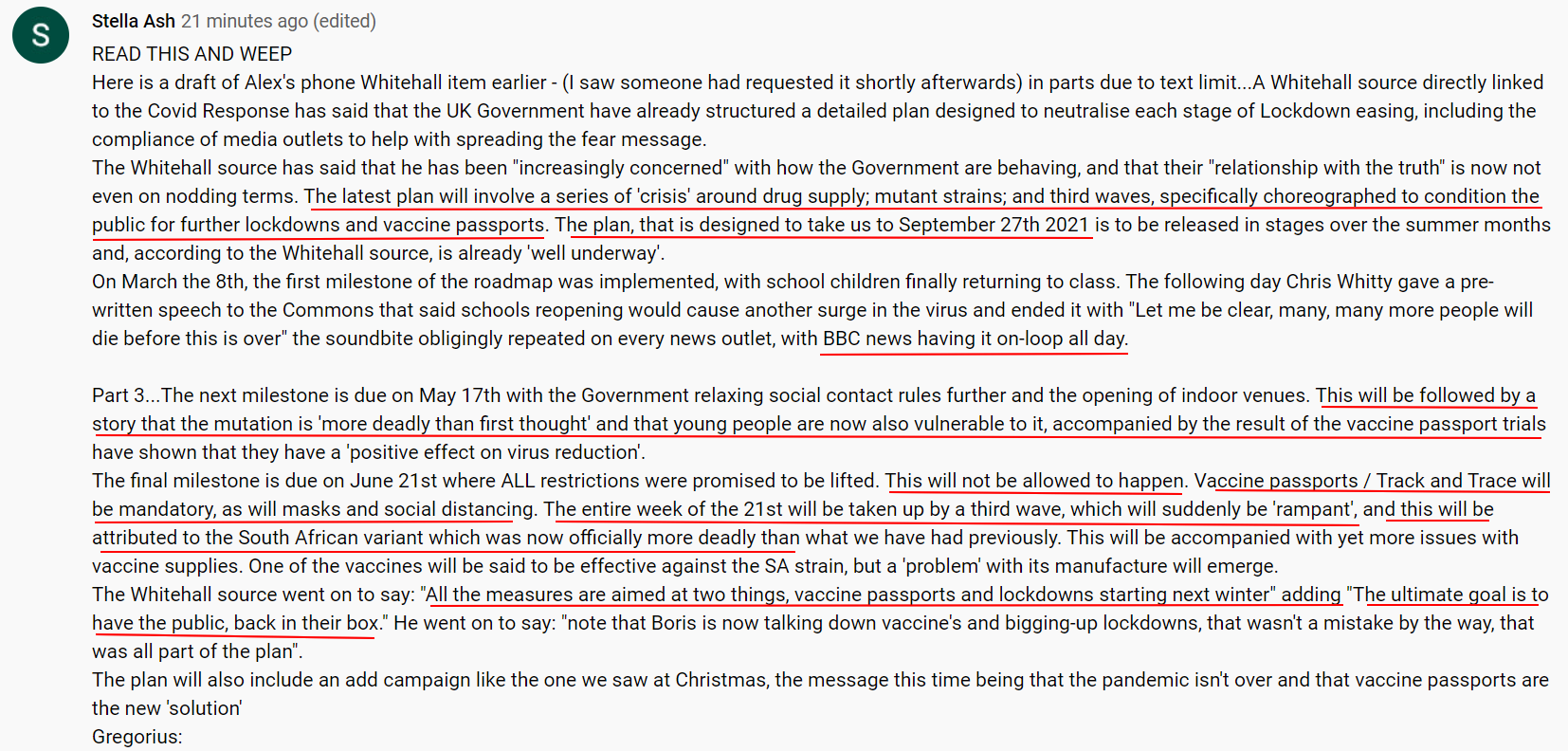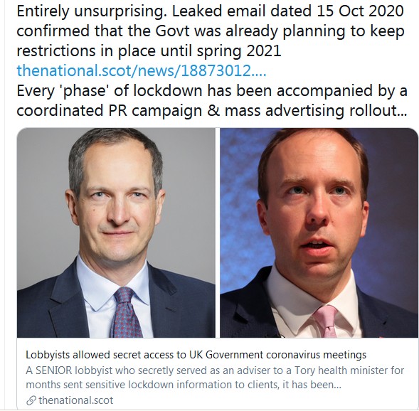 A report in The National newspaper based in Scotland reveals insider in the UK govt were emailing amongst themselves back in Oct 2020 that they had planned to keep the country in lockdown until April 2021 which they have done so.