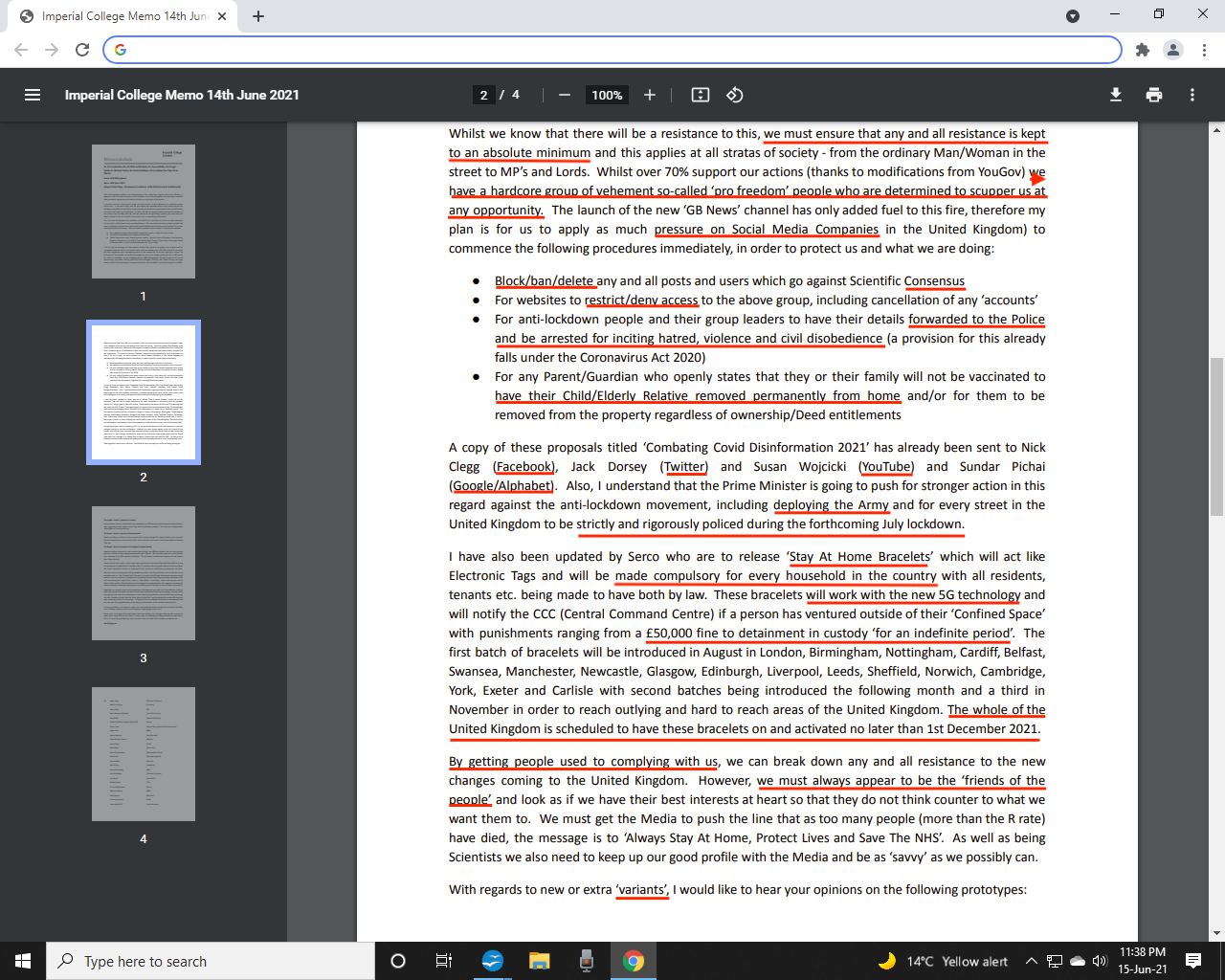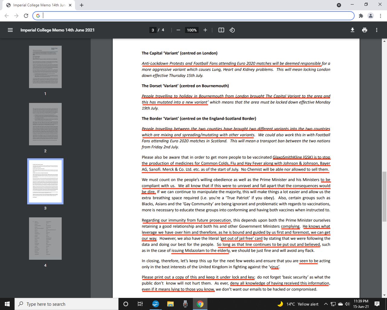 | Exposing The Fraud Of COVID-19: Is This Secret Memo A Super Screw-Up By The British COVID Criminals?! Or Is It Their Rightfully Stolen Blueprint? international | crime and justice | news report Monday June 21, 2021 23:49 by 1 of Indy![]() An apparent secret memo from Neil Ferguson to the UK SAGE group appears to lay out a plan for permanent lockdowns and is indeed very sinister. It is so f**king evil one would automatically think it has to be fake and lets hope it is. However if any of what is said in the memo comes to pass then we know the plan has merit. Judge for yourself but keep it in mind in the months ahead. From https://northerntruthseeker.blogspot.com/2021/06/exposing-fraud-of-covid-19-is-this.html I had a most interesting email sent to me a short time ago by one of my best supporters and avid fan of this blog.... I read the material he sent, as he said 'NTS... This, if it is legitimate, may finally destroy the entire COVID-19 fraud once and for all'..... I read the entire article, and I knew right away it belongs here to everyone to assess for themselves... So, without any further adieu, I want to present the following report that comes courtesy of the State Of The Nation website, at www.stateofthenation.co, that is entitled: "IS THIS SECRET MEMO A SUPER SCREW-UP BY THE BRITISH COVID CRIMINALS?! OR IS IT THEIR RIGHTFULLY STOLEN BLUEPRINT?".... This may indeed be the one piece that DESTROYS the fraud 'COVID narrative' IF it does pan out and prove to be legitimate.... Here is that article right here for everyone to read for themselves, and I do have my own thoughts to follow: IS THIS SECRET MEMO A SUPER SCREW-UP BY THE BRITISH COVID CRIMINALS?! OR IS IT THEIR RIGHTFULLY STOLEN BLUEPRINT? New 4-Page Memo Sent Out by Neil M. Ferguson from the Imperial College London Purportedly to Key Covid Crime Spree Co-Conspirators Spells Out Secret Plot to Effectuate the “Permanent Lockdown of the UK” |