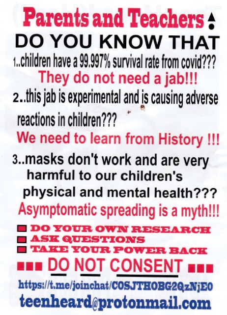 The first two images here link to a scanned leaflet given out at a recent rally cover disability rights and this relates to mask mandates. The leaflet was scanned in as two separate PDF files which you can download here. Use the menu option View->Rotate View->Rotate Clockwise to view problem and zoom in as required This is from Ivor Cummins website FINALLY a Clinical Trial on Facemasks in Children – Parents Take Note!https://thefatemperor.com/finally-a-clinical-trial-on-facemasks-in-children-parents-take-note/NON-CENSORABLE as this is a simple summary of study * just published in the Journal of the American Medical Association – JAMA * ALL Parents should be aware of the emerging science – their kids are THEIR responsibility. Download the vid here: https://we.tl/t-nPkQHzkh5T NOTE: My extensive research and interviewing / video/sound editing and much more These two images are from Teen Heard which is a campaign to end masks in schools and stop kids be jabbed with the death vaccines -aka gene therapy Links to their campaign arehttps://teenheard.ie/ -TeenHeard websitehttps://twitter.com/TeenHeard -TeenHeard on Twitter https://t.me/joinchat/COSJTHOBG20zNjEO - Help End Masks in School Telegram Channel. You need to download the Telegram App to join. Can be contacted at: teenheard@protonmail.com See also the separate group https://t.me/s/informedconsentireland/ Informed Consent Ireland Telegram Channel http://teenheard.ie/irisheducationalliance/ -Irish Educational Alliance Tracey O'Mahoney is a barrister who is helping use her skills to combat this assault on our rights. See has produced many videos and other material so it is always worth checking either her Twitter or Facebook accounts. How to Handle Coercion From Your Employer Trying to Force You to Take the VaccineIf you are being forced to Vax in order to keep your job, here’s a great way to handle it. (Conditional acceptance) The secret is NOT to refuse it… A friend in the NHS is being pressured to take the jab: he wrote to his senior, “I write with regard to the matter of potential covid vaccine and my desire to be fully informed and appraised of ALL facts before going ahead. I’d be most grateful if you could please provide the following information, in accordance with statutory legal requirements.”:
